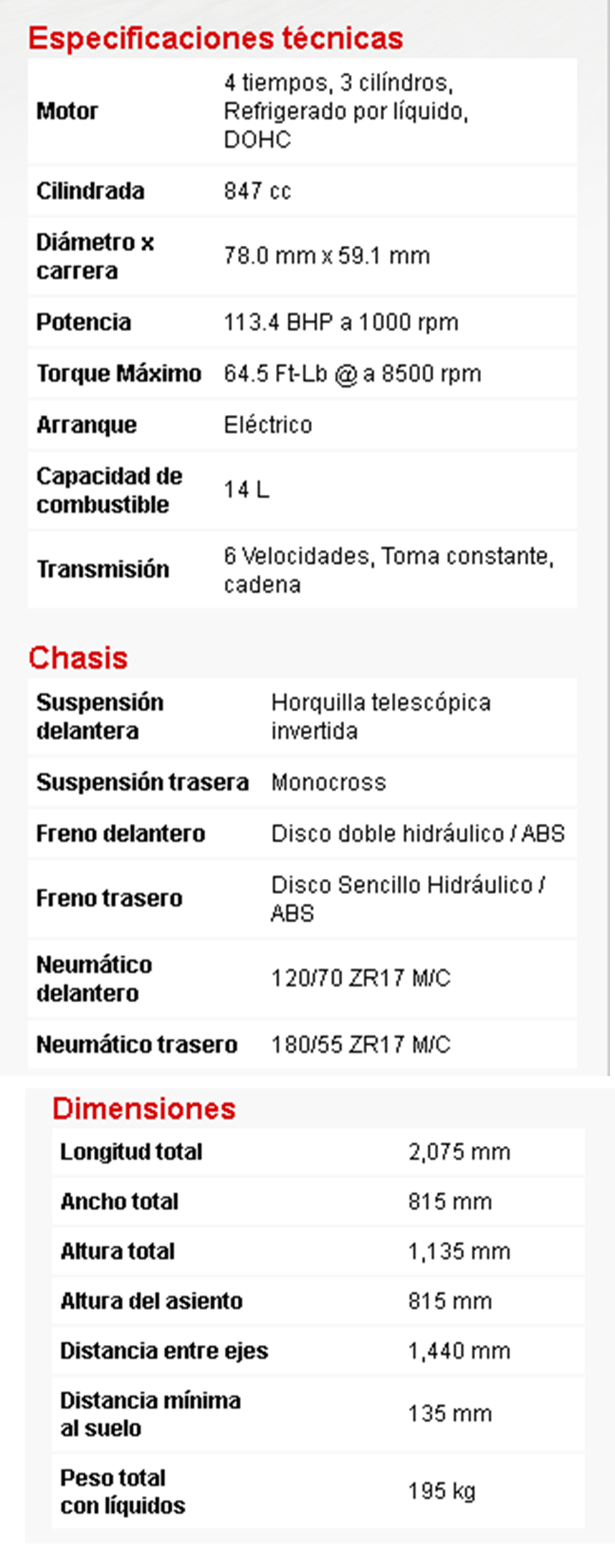 El nuevo modelo dentro de la gama de tricilíndricas Crossplane de 850 cc tiene un alto par motor que da lugar a una imponente aceleración. La ligereza del chasis de aluminio se une a una postura de conducción vertical para producir una excelente experiencia de conducción y la máxima agilidad.